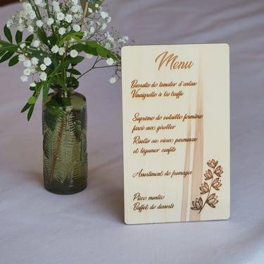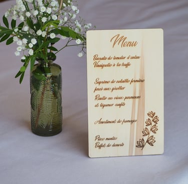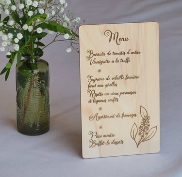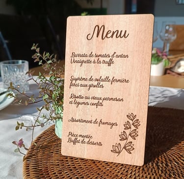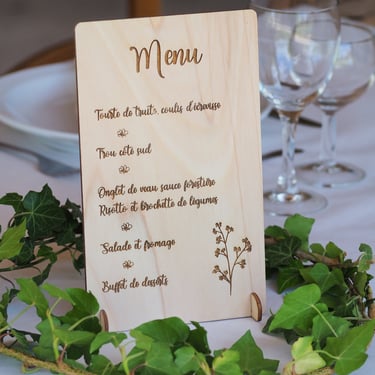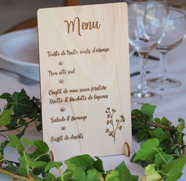 Les menus, plans de tables et autres pancartes peuvent être réalisés avec des encoches et livrés avec des pieds pour pouvoir tenir en position verticale.