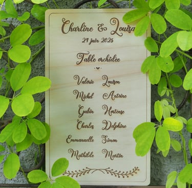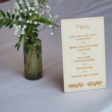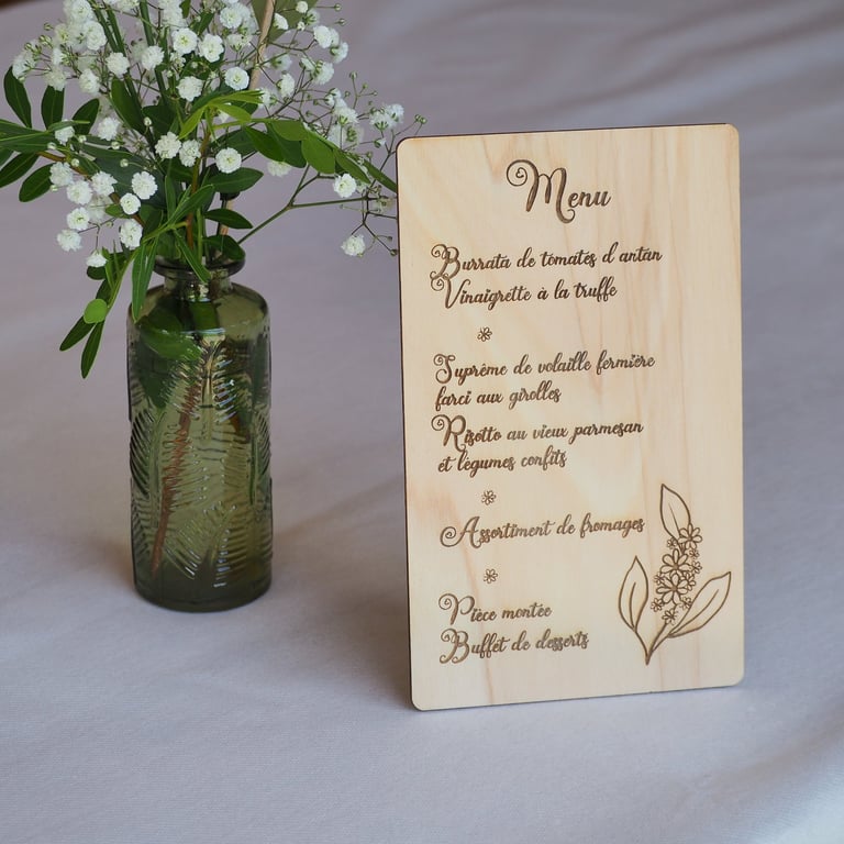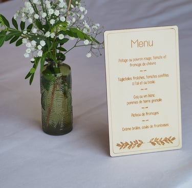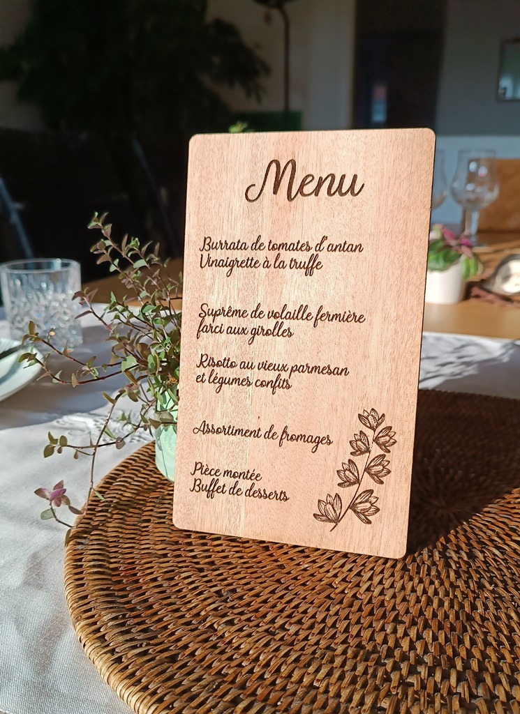 Les menus, plans de tables et autres pancartes peuvent être réalisés avec des encoches et livrés avec des pieds pour pouvoir tenir en position verticale.