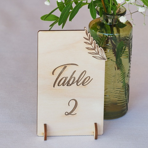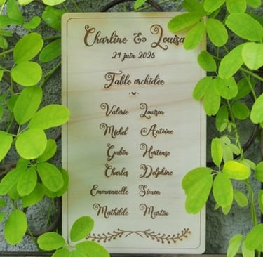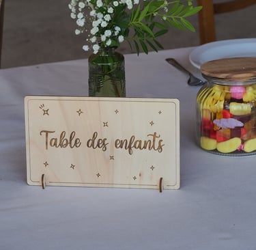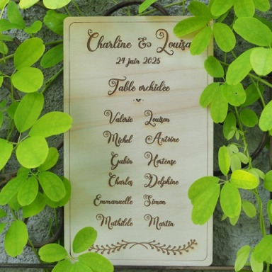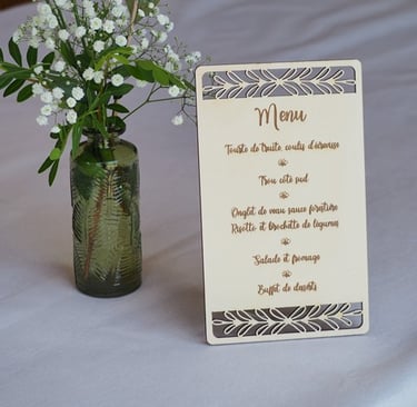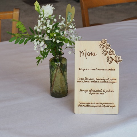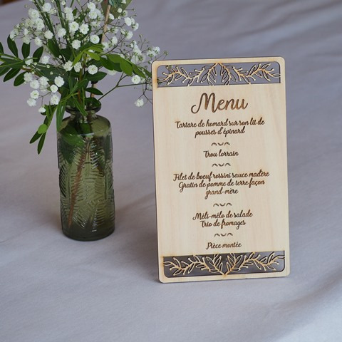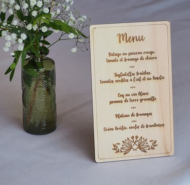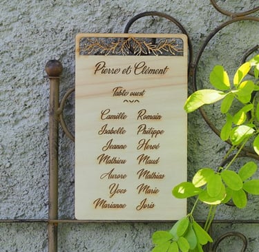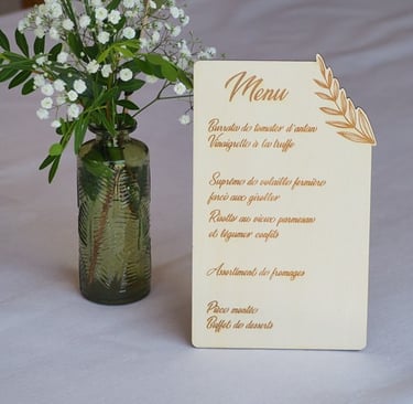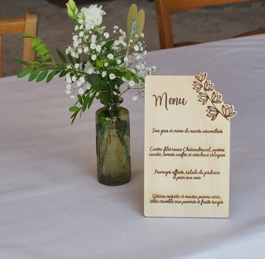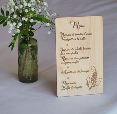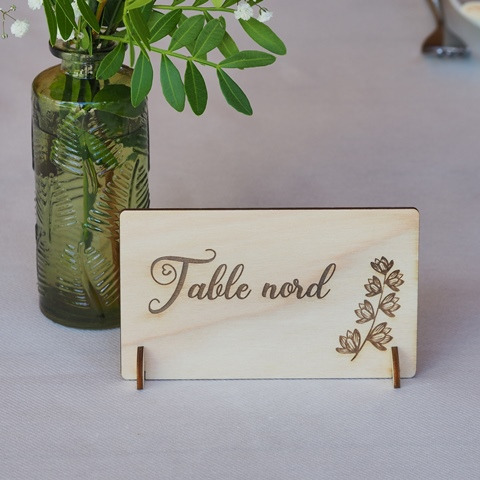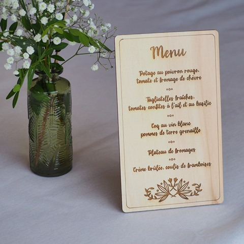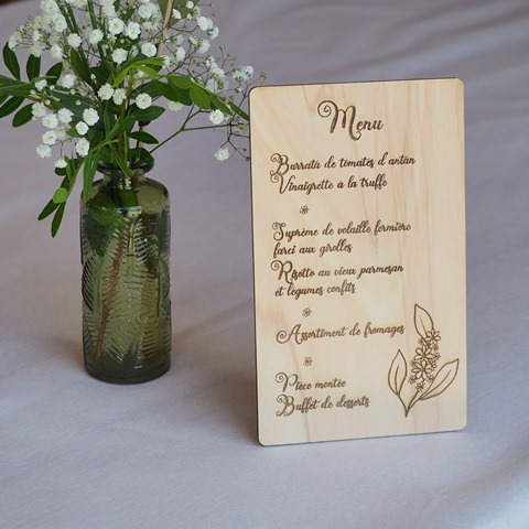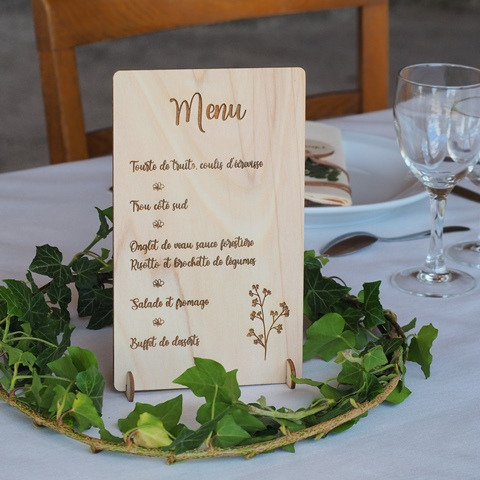 Sélection de menus et plans de table en bois personnalisables pour s'intégrer au mieux à la décoration de votre table
